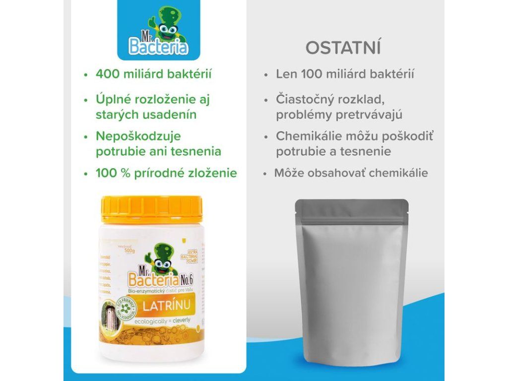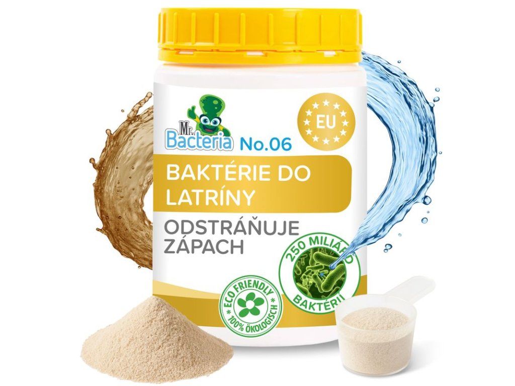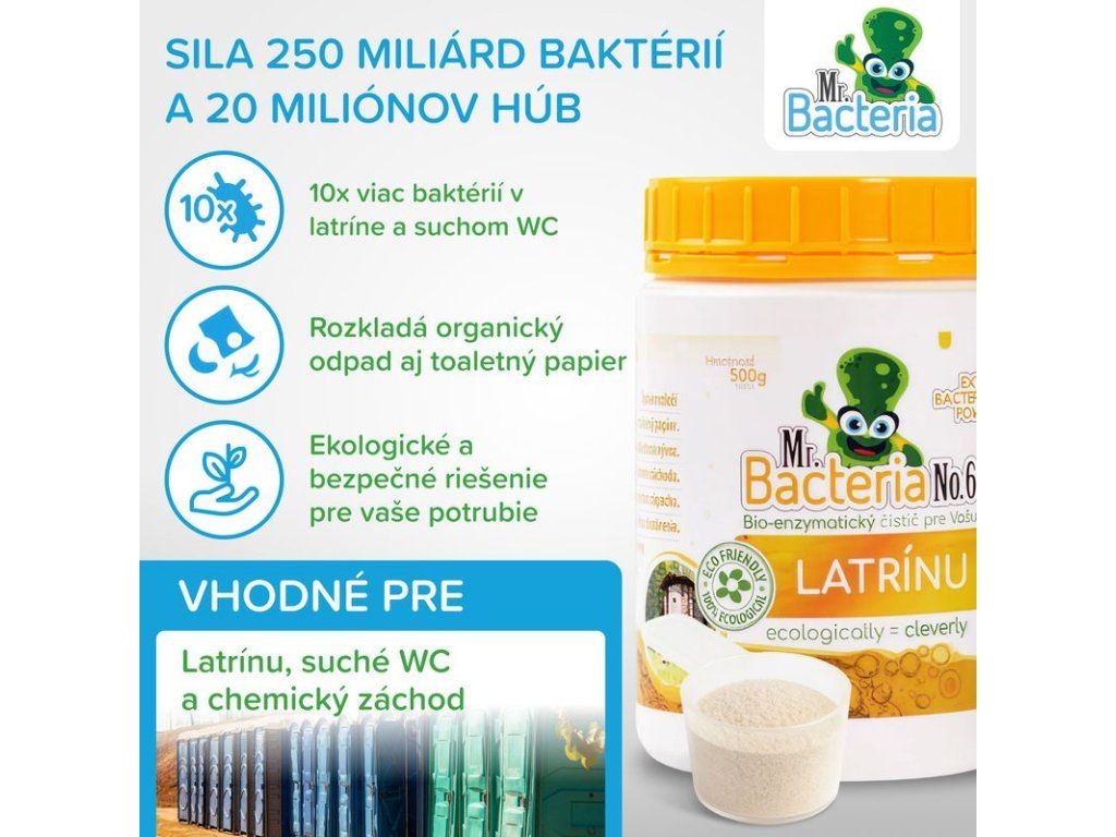 Mr.Bacteria No.6 je biologický aktivátor určený na údržbu latrín a suchých WC, ktorý obsahuje iba voľne sa v prírode vyskytujúce baktérie a enzýmy.