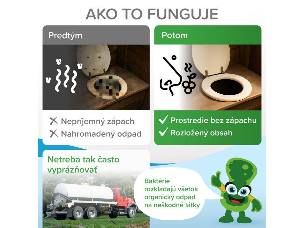 Prípravok naštartuje biodegradačné procesy, čím zabraňuje tvorbe usadenín a kalov a optimalizuje bakteriálnu účinnosť v odpadových systémoch.