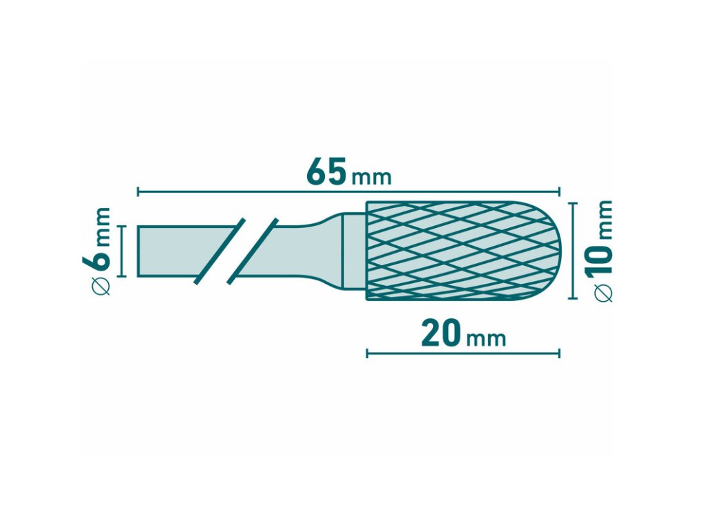 Fréza karbidová valcová, polguľaté čelo, pr. 10mm, rezná dĺžka 20mm, stopka 6mm, celková dĺžka 65mm