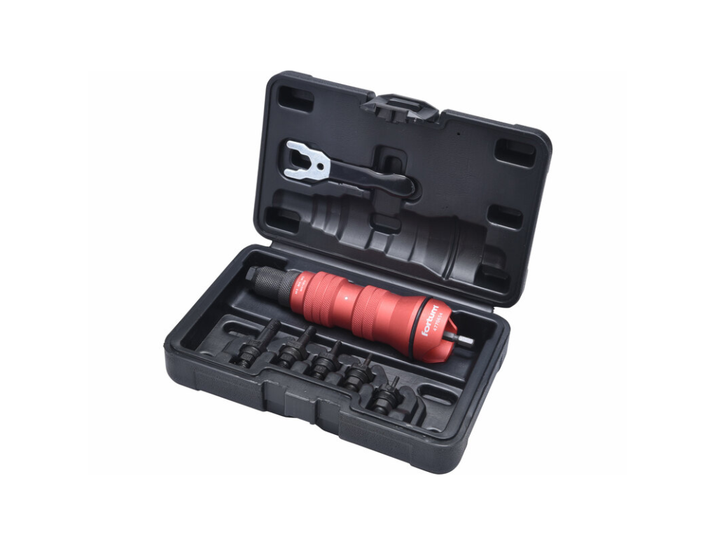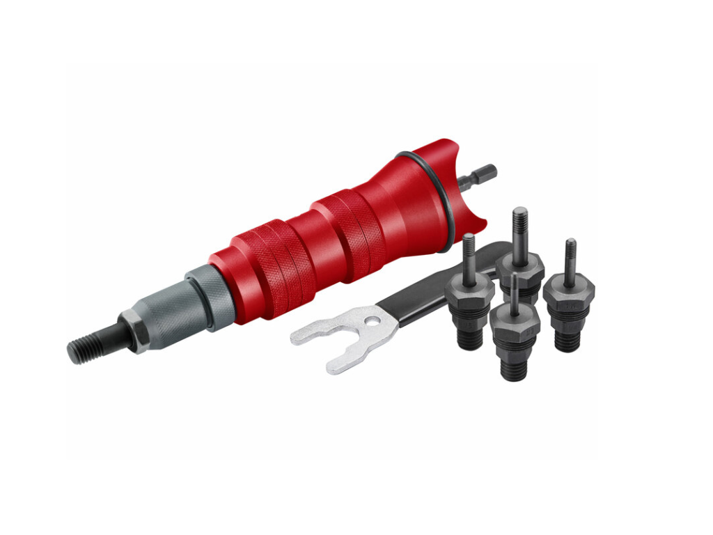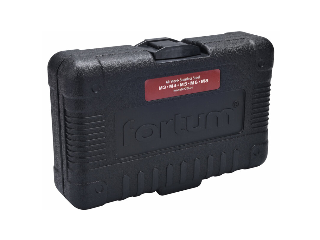 profi nitovací nadstavec Fortum® je pri upnutí do skľučovadlovej hlavy aku vŕtačky, elektrickej alebo pneumatickej vŕtačky určený na použitie ako nitovačka na usadzovanie trhacích nitov z hliníka, ocele a antikorovej ocele s priemerom tela 2,4-6,4 mm