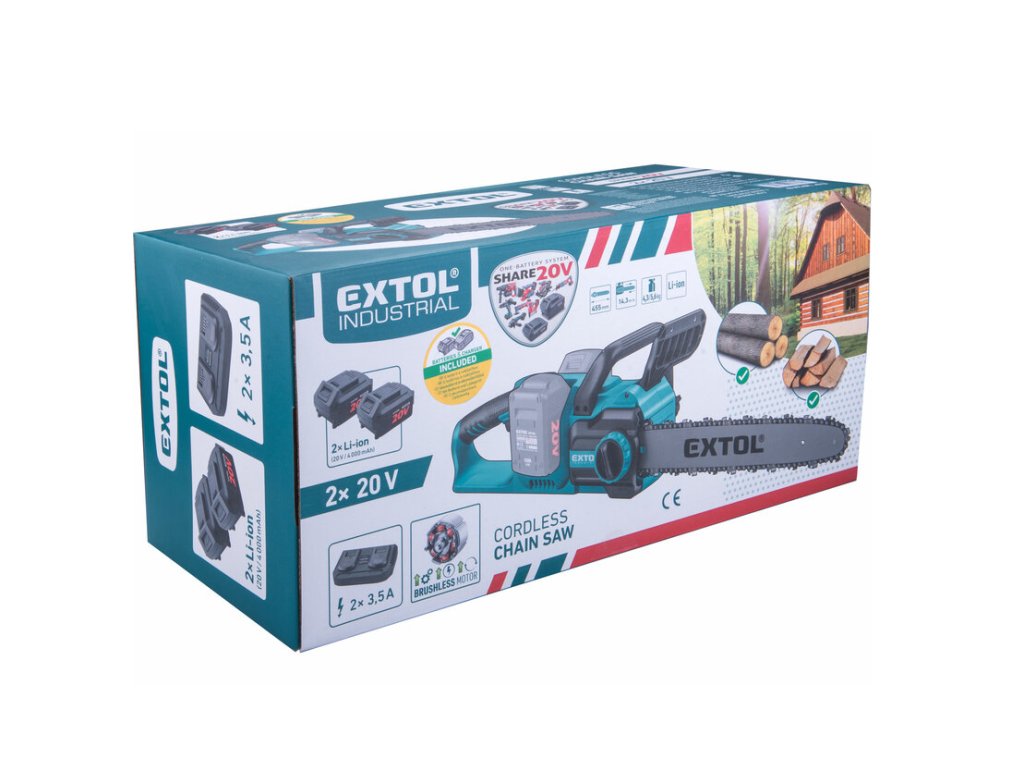 Píla reťazová Share20V, 2x 4Ah, čepeľ 300mm, bezuhlíkový motor, EXTOL INDUSTRIAL