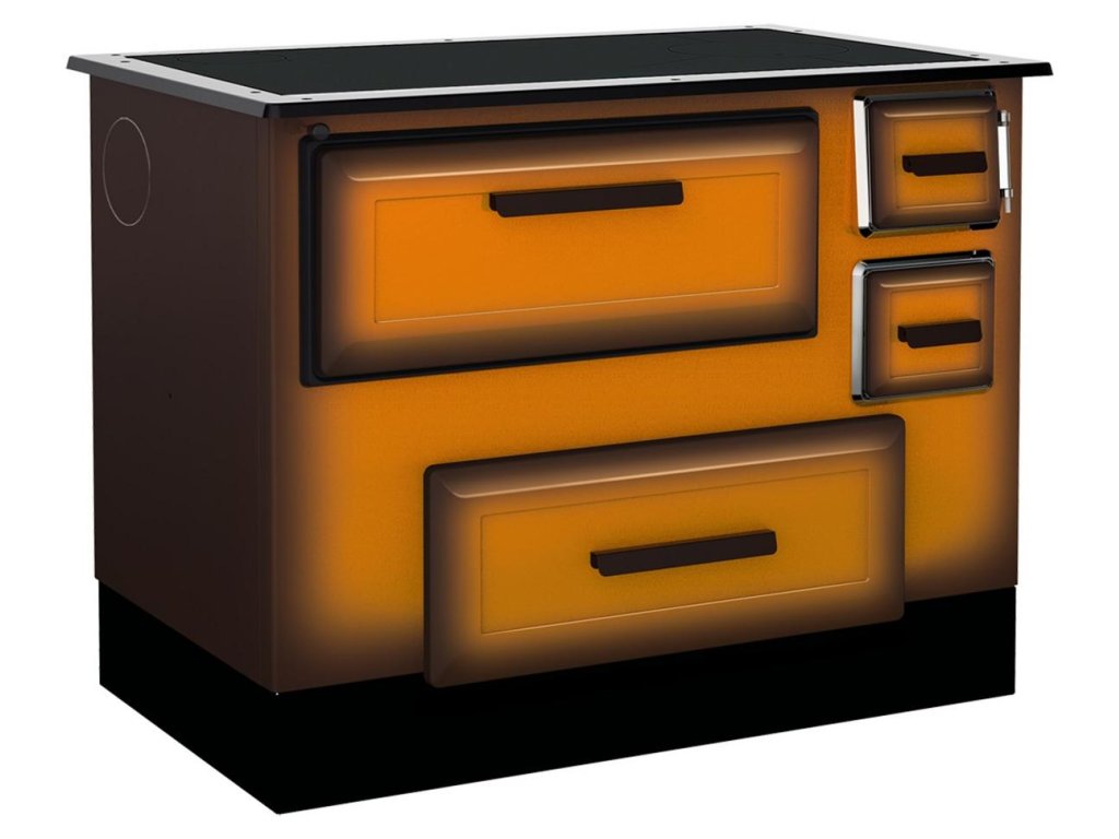 Hnedý sporák na pevné palivo v rustikálnom dizajne, vhodný na vykurovanie, varenie a pečenie.