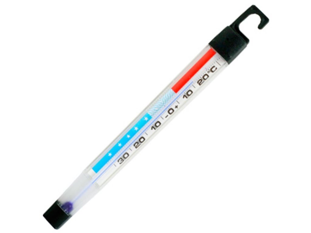 Plastový chladničkový teplomer hranatého tvaru s háčikom s dĺžkou 15 cm.