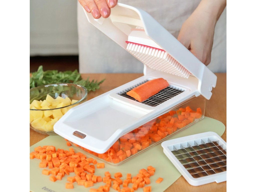 ľahko a rýchlo nakrája čerstvú zeleninu a ovocie na malé alebo väčšie kocky či hranolky