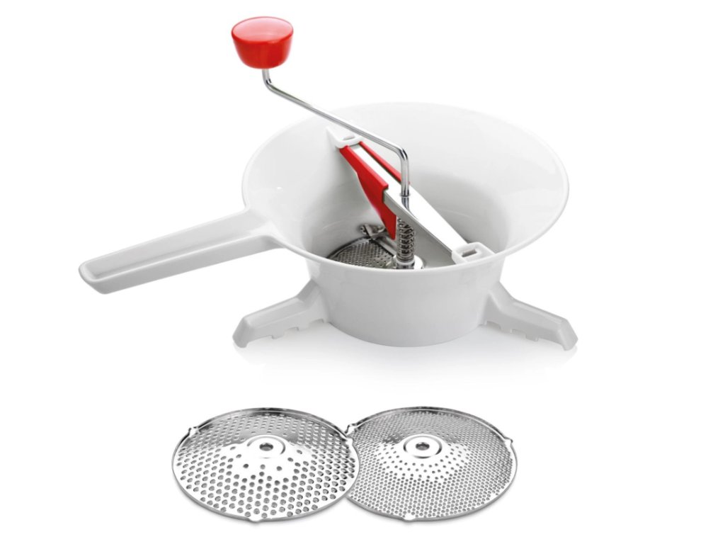 - disk s veľkými otvormi je vhodný na pasírovanie varených zemiakov, mrkvy, petržlenu, zeleru, cibule, jabĺk, paradajok, strukovín atď.