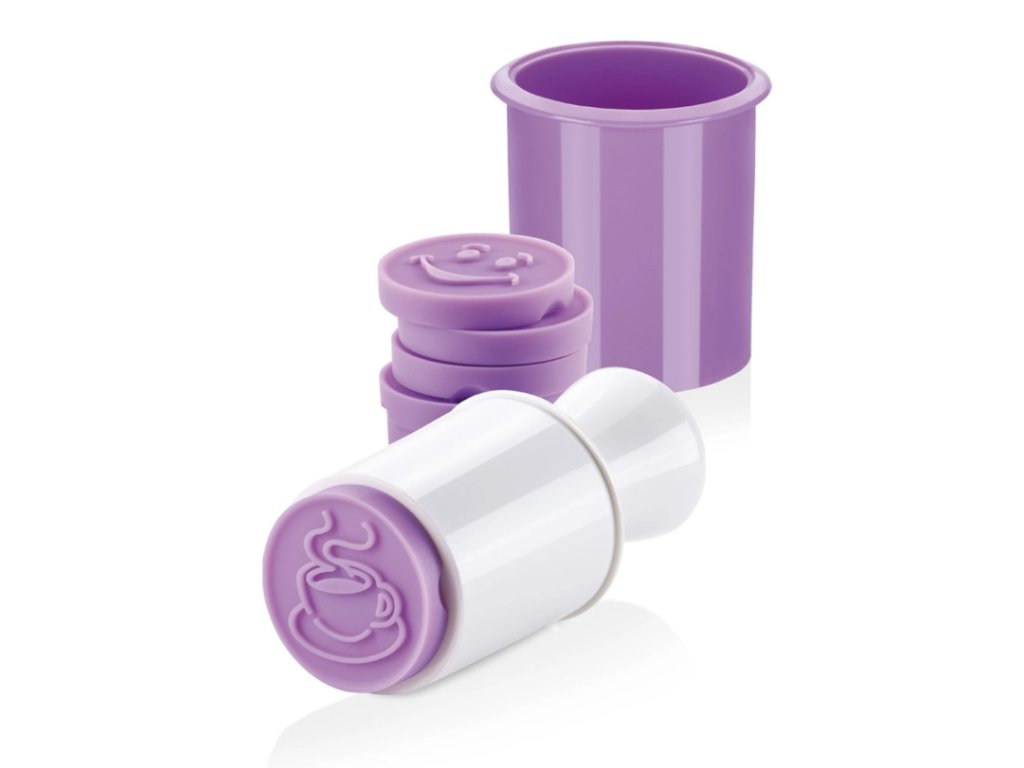súprava obsahuje razítko, šesť originálnych ľahko vymeniteľných dekorov a guľatý vykrajovač