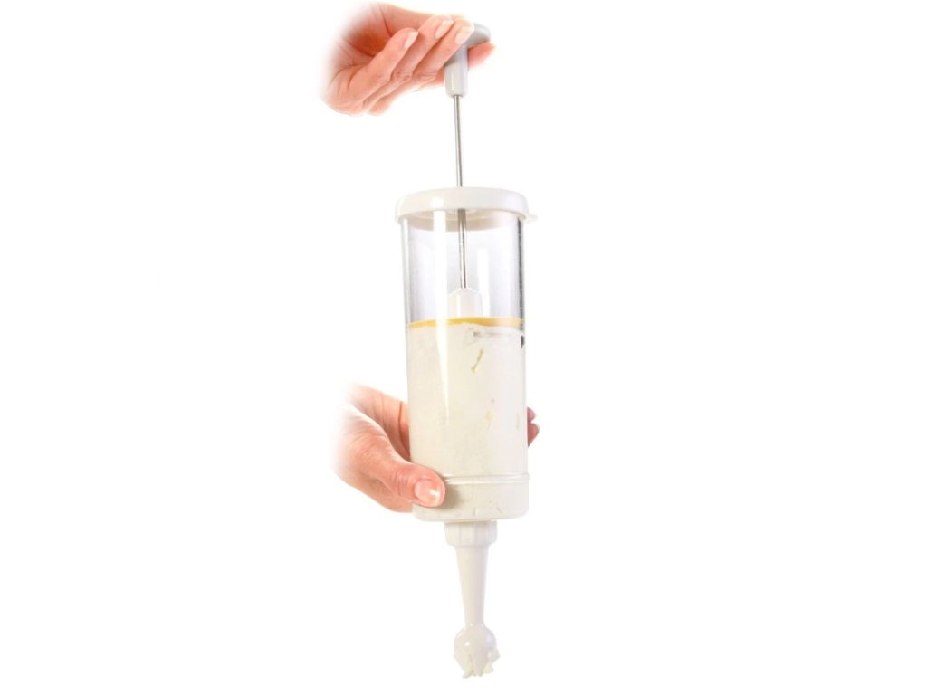 vynikajúci na prípravu domácej šľahačky a zdobenie priamo zo šľahača, hotovú šľahačku nie je potrebné premiestňovať do zdobiaceho vrecka