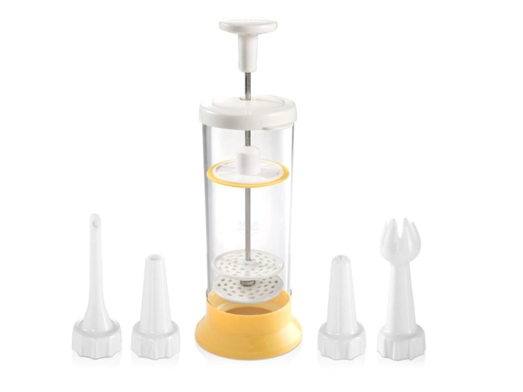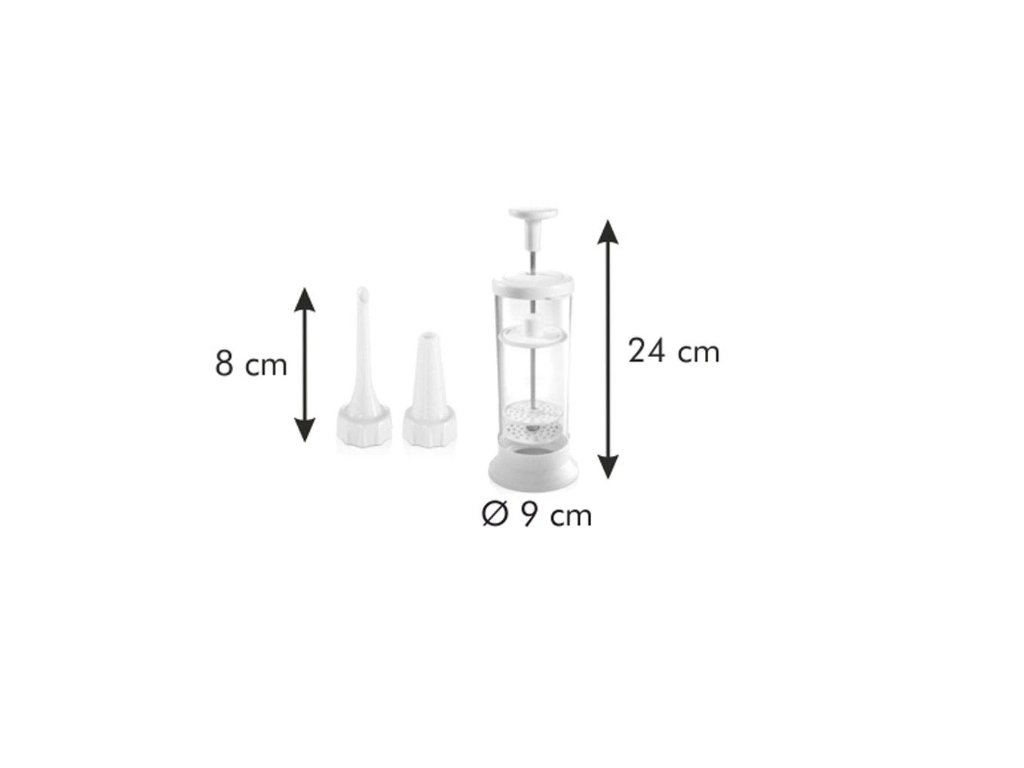 dodávaný s tromi dekoračnými tryskami a plniacou tryskou, praktický stojanček má protišmykovú úpravu