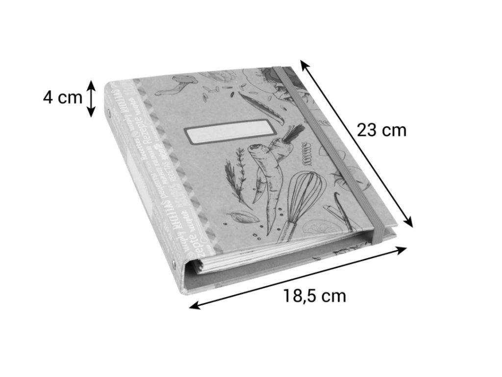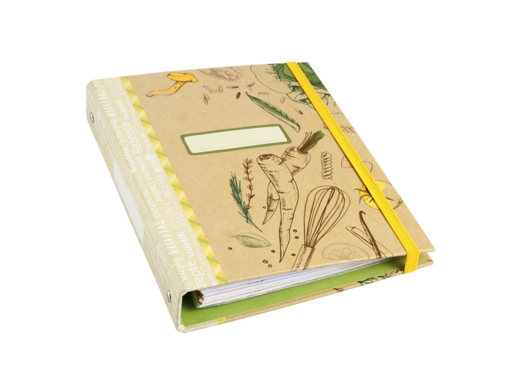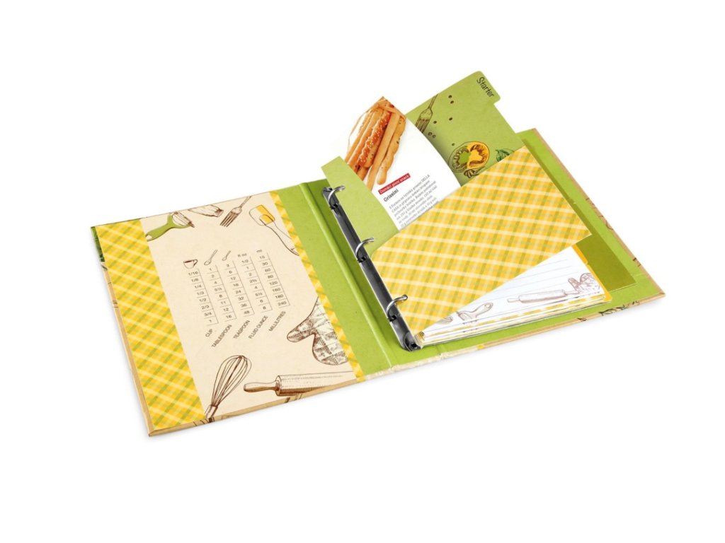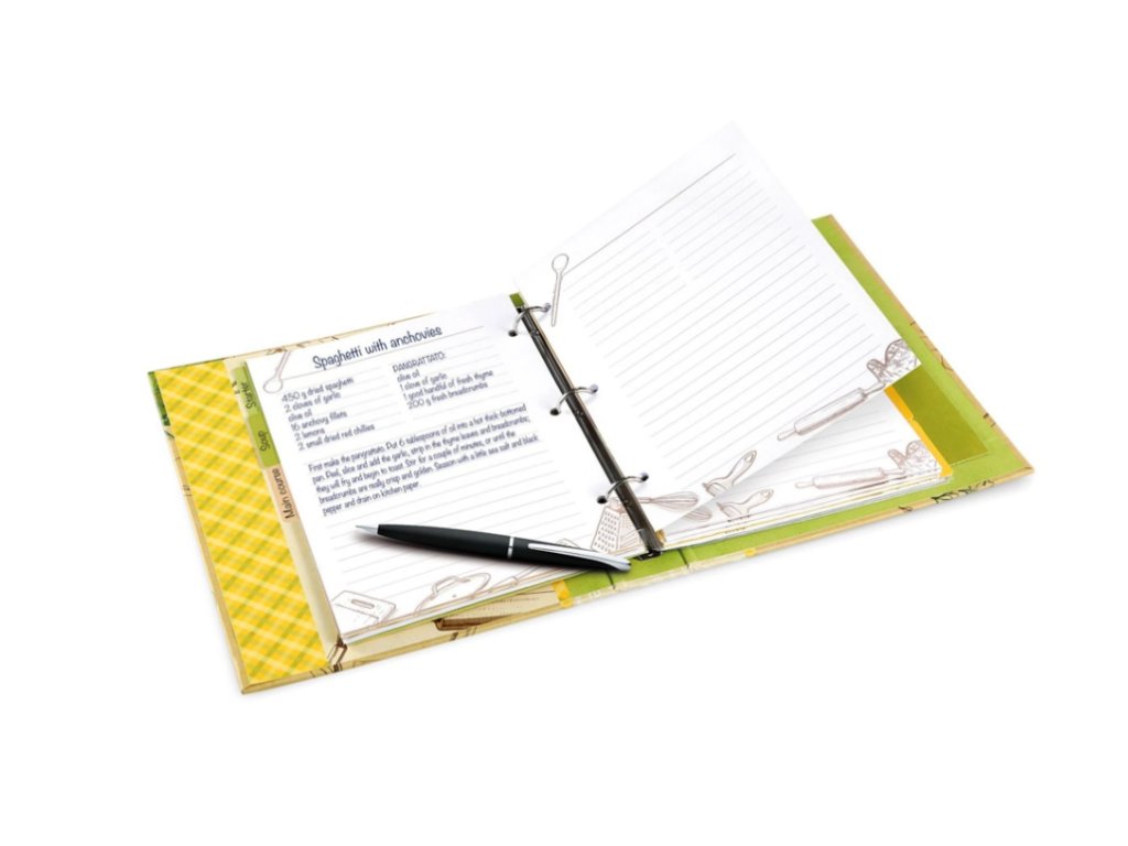 kovový krúžkový hrebienok s piatimi záložkami, vreckami na poznámky, 50 listami na prehľadné radenie a ľahké vyhľadávanie receptov piatimi transparentnými zakladacími zložkami
