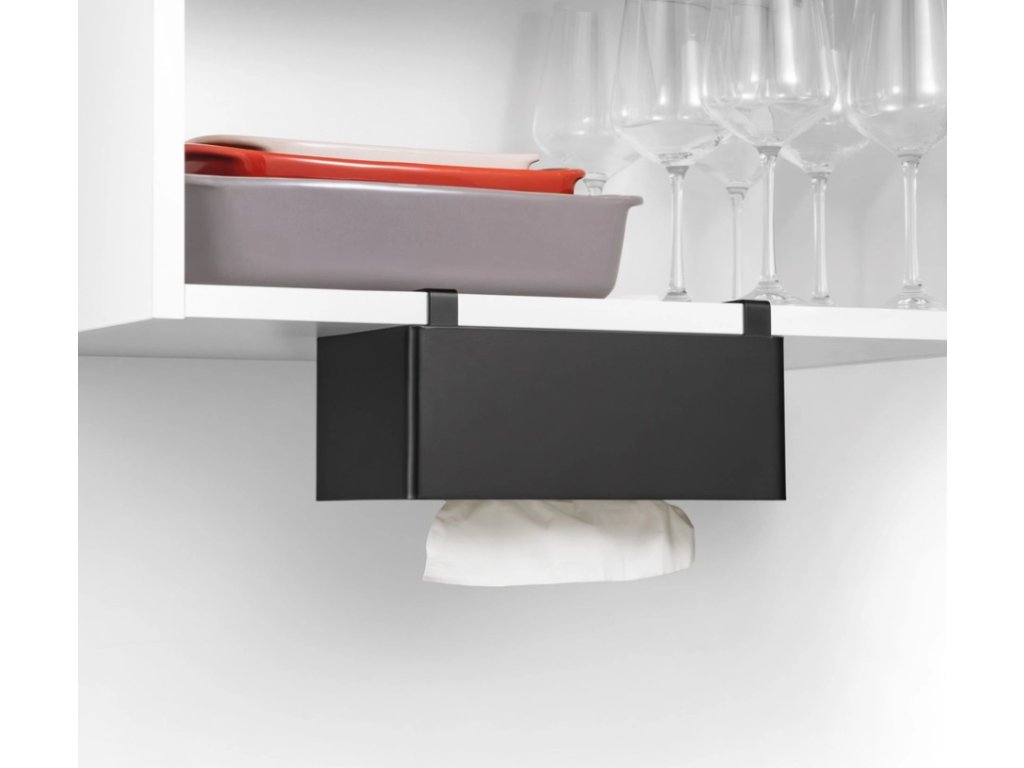umožňuje mať papierové vreckovky v krabičke uložené na závesnej lište na polici kuchynskej skrinky