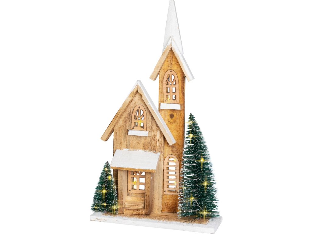 elegantná vianočná dekorácia - drevený kostol s LED osvetlením